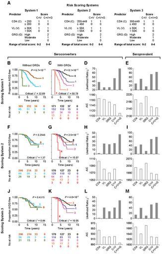 | Keywords: CCL3L1-CCR5 Genotype Improves the Assessment of AIDS Risk in HIV-1-Infected Individuals -Figure 1.png Panel A shows the three risk-scoring systems based on baseline CD4+ T cell counts C viral load V and GRGs G in the seroconverting and separately in the seroprevalent component of the WHMC HIV+ cohort Panels B “C F “G and J “K depict Kaplan Meier KM plots for progression to AIDS 1987 criteria before and after accounting for the GRGs in the risk-scoring systems indicated on the left axis The critical ratio χ2 values are indicated within the KM plots Panels D H and L depict likelihood ratio χ2 and AIC estimates in seroconverters and panels E I and M depict the same estimates for the seroprevalent subjects Uploaded for use in s CCL3L1-CCR5 Genotype Improves the Assessment of AIDS Risk in HIV-1-Infected Individuals http //www plosone org/article/info 3Adoi 2F10 1371 2Fjournal pone 0003165 Sept 08 Hemant Kulkarni Brian K Agan Vincent C Marconi Robert J O'Connell Jose F Camargo Weijing He Judith Delmar Kenneth R Phelps George Crawford Robert A Clark Matthew J Dolan Sunil K Ahuja This is an open-access article distributed under the terms of the Creative Commons Public Domain declaration which stipulates that once placed in the public domain this work may be freely reproduced distributed transmitted modified built upon or otherwise used by anyone for any lawful purpose cc-pd AIDS Genotypes |