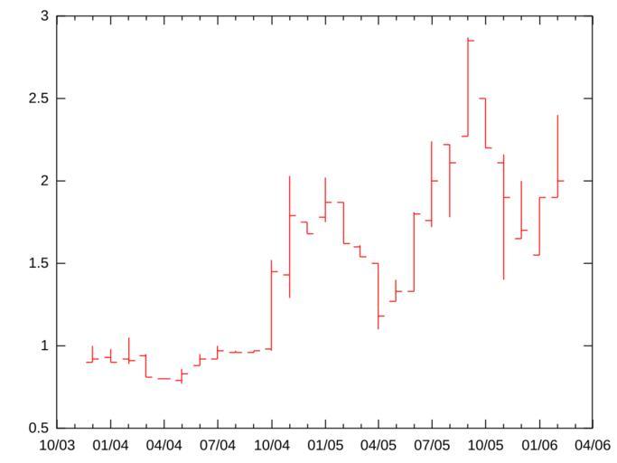 | Keywords: CCX 2004 Vintage Price Chart.svg en wikipedia 2012 January 11 replaces Image Image-CCX 2004 Vintage Price Chart png Source data From original image Date Open High Low Close 12/03 0 90 1 00 0 90 0 92 1/04 0 93 0 98 0 90 0 90 2/04 0 92 1 05 0 89 0 91 3/04 0 94 0 95 0 81 0 81 4/04 0 80 0 80 0 80 0 80 5/04 0 79 0 86 0 77 0 83 6/04 0 88 0 95 0 88 0 92 7/04 0 92 1 00 0 92 0 97 8/04 0 96 0 97 0 96 0 96 9/04 0 96 0 97 0 96 0 97 10/04 0 98 1 52 0 97 1 45 11/04 1 43 2 03 1 29 1 79 12/04 1 75 1 75 1 68 1 68 1/05 1 78 2 02 1 75 1 87 2/05 1 87 1 87 1 62 1 62 3/05 1 60 1 61 1 54 1 54 4/05 1 50 1 50 1 10 1 18 5/05 1 27 1 40 1 27 1 33 6/05 1 33 1 81 1 33 1 80 7/05 1 76 2 24 1 72 2 00 8/05 2 22 2 22 1 78 2 11 9/05 2 27 2 87 2 27 2 85 10/05 2 50 2 50 2 20 2 20 11/05 2 11 2 16 1 40 1 90 12/05 1 65 2 00 1 65 1 70 1/06 1 55 1 90 1 55 1 90 2/06 1 90 2 40 1 90 2 00 en wikipedia Premeditated Chaos CommonsHelper 2008-02-27 SebDE wikipedia en SebDE Original upload log page en wikipedia CCX_2004_Vintage_Price_Chart svg 2008-02-27 17 40 SebDE 640×480× 7677 bytes <nowiki>replaces Image Image-CCX 2004 Vintage Price Chart png</nowiki> Check categories 2012 January 12 en wikipedia Chicago_Climate_Exchange Carbon 11 Environmental economics Environmental organizations Conservation organizations Climate change Financial services companies of the United States Energy statistics of the United States Sustainability Environment of the United States Financial services companies Carbon Climate of the United States |