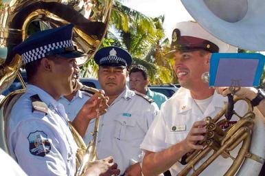 Keywords: Celebrating in Samoa DVIDS186232.jpg en Chief Petty Officer Brian Chaplow musician a member of the Pacific Fleet Band embarked with Pacific Partnership 2009 practices with members of the Royal Samoan Police Band before marching in a parade honoring National Library Week Pacific Partnership is a humanitarian and civil assistance mission in the Pacific Fleet area of responsibility This year Pacific Partnership will travel to Oceania including Kiribati Republic of the Marshall Islands Samoa Solomon Islands and Tonga The Military Sealift Command dry cargo/ammunition ship USNS Richard E Byrd serves as the enabling platform for Pacific Partnership 2009-07-06 https //www dvidshub net/image/186232 090706-N-+++++-001 2009-07-09 00 02 UPOLU WS PD-USGov-Military-Navy Pacific Partnership 2009 Pacific Fleet Band Images from DoD uploaded by Fæ |