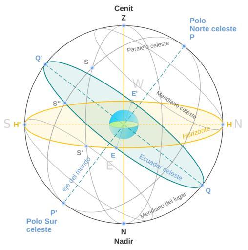 | Keywords: Celestial-sphere-ES.svg en How the coordinates of the celestial sphere are projections of the meridians and parallels of the earth there are portions of the celestial sphere that can not be observed by persons located in the Northern Hemisphere of Earth and vice versa es Cómo las coordenadas de la Esfera Celeste son proyecciones de los Meridianos y Paralelos de la Tierra existen porciones de la Esfera Celeste que no podrán ser observadas por personas ubicadas en el Hemisferio Norte de la Tierra y viceversa own Divad 04/06/2010 Diseño ex profeso para Wikipedia Astronomical diagrams |