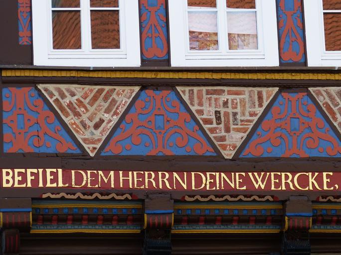 Keywords: celle lower saxony old town historically facade building truss fachwerkhaus bar saying god faith factory mr pattern triangle