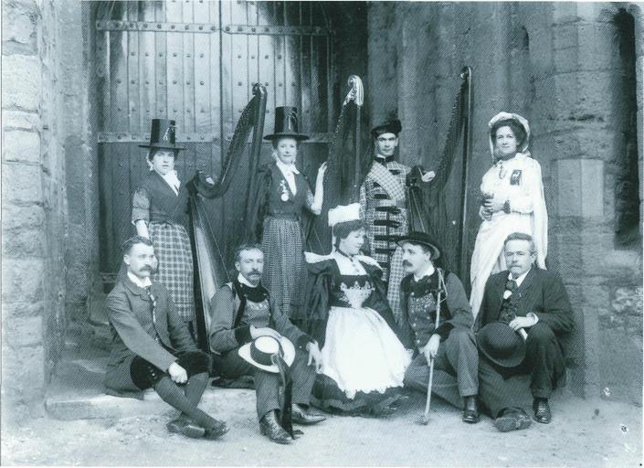 | Keywords: Celtic congress 1904.jpg en photograph of delegates at the Celtic Congress 1904 Caernarfon Back row Maggie Jones harpist of Arfon ; Mrs Gruffydd Richards chief harpist of Gwent David Roberts blind harpist of Mawddwy Gwyneth Vaughan Front row Pedwr James Emile Hamonic Lena Botrel Theodore Botrel Professor Paul Barbier A Book of Mad Celts John Wickens d 1936 1904 Celtic art National costumes Frame harps Théodore Botrel Lena Botrel PD-old Émile Hamonic | ||||