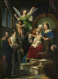 | Keywords: Cena religiosa (1874) - António Manuel da Fonseca.png pt Cena religiosa mostrando Nossa Senhora e Santa Isabel; o Menino Jesus com coroa de espinhos na mão marcando a fronte de Santa Rita de Cássia juntamente com S José e Zacarias; Santo António de joelhos e segurando uma cruz de prata e açucenas e com livro aos pés do qual pende a legenda A M Fonseca Fecit 1874 Sobre as figuras um arcanjo e um anjo en Religious scene with Our Lady and Saint Elizabeth; the Infant Jesus holds the Crown of Thorns on his hand and touches the forehead of Saint Rita of Cascia who is with Saint Joseph and Saint Zachary; Saint Anthony on his knees holds a silver cross and lilies From a book at his feet hangs a scrap of paper that reads A M Fonseca Fecit 1874 Over the figures an archangel and an angel 1874 https //www pcv pt/lot php ID 24896 ref search lot-title sid 2293acce0fa785c1eb0a972f815090ff Palácio do Correio Velho Creator António Manuel da Fonseca other versions Custom license marker 2016 12 22 PD-old-100 1874 paintings 1870s paintings from Portugal António Manuel da Fonseca Paintings of Jesus Christ as a child 19th-century paintings of Virgin Mary Paintings of Virgin Mary in Portugal Paintings of Saint Rita of Cascia Paintings of Saint Joseph in Portugal 19th-century paintings of Saint Joseph Paintings of Saint Zachary Paintings of Saint Anthony of Padua in Portugal 19th-century paintings of Saint Anthony of Padua 19th-century paintings of angels Paintings of angels in Portugal Green clothing in art angel |
