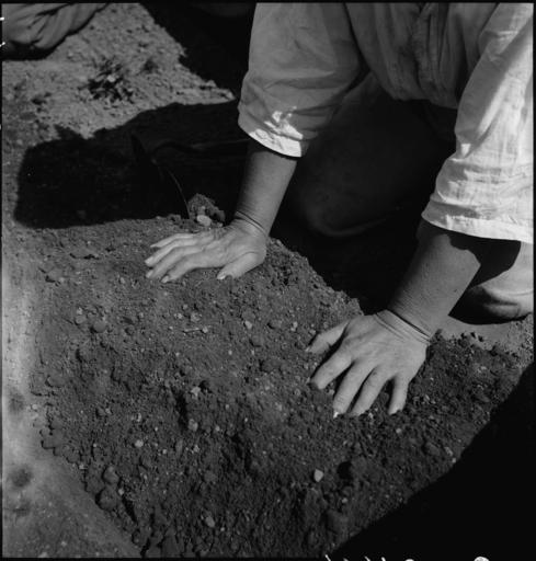 | Keywords: Centerville, California. Hands of woman farm- worker preparing soil for transplanting tomato plants . . . - NARA - 537591.jpg Scope and content The full caption for this photograph reads Centerville California Hands of woman farm- worker preparing soil for transplanting tomato plants in a field in Alameda County California several weeks before evacuation Farmers and other evacuees of Japanese ancestry will be given opportunities to follow their callings in War Relocation Authority centers where they will spend the duration General notes 537591 Local identifier 210-G-C244 Department of the Interior War Relocation Authority 02/16/1944 - 06/30/1946 NARA-Author Lange Dorothea 1895-1965 Photographer 1372774 <br /> Still Picture Records Section Special Media Archives Services Division NWCS-S National Archives at College Park 8601 Adelphi Road College Park MD 20740-6001 1942-03-27 Record group Record Group 210 Records of the War Relocation Authority 1941 - 1989 Record group ARC 537 Central Photographic File of the War Relocation Authority compiled 1942 - 1945 Series ARC 536000 File unit File unit ARC Variant control numbers NAIL Control Number NWDNS-210-G-C244 Other versions <gallery> File Centerville _California _Hands_of_woman_farm-_worker_preparing_soil_for_transplanting_tomato_plants_ _ _ _-_NARA_-_537591 tif tif File Centerville _California _Hands_of_woman_farm-_worker_preparing_soil_for_transplanting_tomato_plants_ _ _ _-_NARA_-_537591 jpg jpg </gallery> NARA-cooperation PD-USGov Japanese American internment processing in Centerville Alameda County California Women at work in California Farms in California Solanum lycopersicum Dorothea Lange Black and white photographs of women |