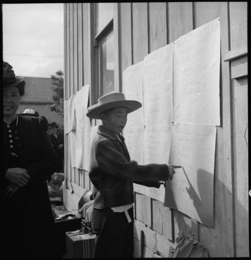| Keywords: Centerville, California. These posters on the outside wall of the Japanese American Citizens League . . . - NARA - 537560.jpg Scope and content The full caption for this photograph reads Centerville California These posters on the outside wall of the Japanese American Citizens League quarters list families of Japanese ancestry names and buses to which they have been assigned for evacuation to the Assembly center This boy is finding his family place General notes 537560 Local identifier 210-G-C213 Department of the Interior War Relocation Authority 02/16/1944 - 06/30/1946 NARA-Author Lange Dorothea 1895-1965 Photographer 1372774 <br /> Still Picture Records Section Special Media Archives Services Division NWCS-S National Archives at College Park 8601 Adelphi Road College Park MD 20740-6001 1942-05-09 Record group Record Group 210 Records of the War Relocation Authority 1941 - 1989 Record group ARC 537 Central Photographic File of the War Relocation Authority compiled 1942 - 1945 Series ARC 536000 File unit File unit ARC Variant control numbers NAIL Control Number NWDNS-210-G-C213 Other versions <gallery> File Centerville _California _These_posters_on_the_outside_wall_of_the_Japanese_American_Citizens_League_ _ _ _-_NARA_-_537560 tif tif File Centerville _California _These_posters_on_the_outside_wall_of_the_Japanese_American_Citizens_League_ _ _ _-_NARA_-_537560 jpg jpg </gallery> NARA-cooperation PD-USGov Japanese American internment processing in Centerville Alameda County California Dorothea Lange Japanese American Citizens League |