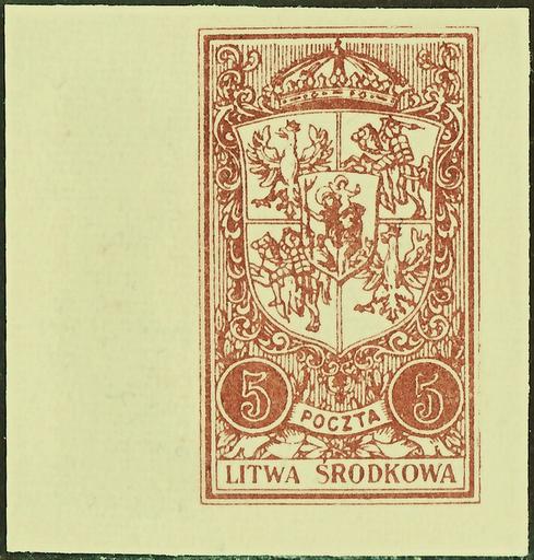| Keywords: Central Lithuania 1921 MiNr038B B002.jpg Stamp of Central Lithuania; 1921; Michel No 38B postage stamp issue; 5 M ; fawn brown; coat of arms of the town Vilnius<br /> Nominal value 5 Marka<br /> Color fawn brown <br /> Watermark none<br /> Postage validity other date 1921-04 - other date 1922-04-16 <br /> Paper thin paper scan of original other date 1921-04 Postal administration for Central Lithuania Polishsymbol PD-LT-exempt stamps PD-old-70 <gallery> File Marka siaredniaja litva jpg the same stamp perforated 13 ¾ or 14 Michel No 38A </gallery> Philately coat of arms of Vilnius; in the crest center the Holy Christopherus other date 1921-04 Postal administration for Central Lithuania State Press Warsaw lithographic print 5 000 000 perforated + imperforate none imperforate Mittellitauen Nr 38B 1921 stamps of Central Lithuania Brown stamps Imperforate stamps Coats of arms of Vilnius |