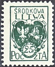 Keywords: Central Lithuania 1921 MiNr 020A B002.png Stamp of Central Lithuania; 1921; Michel No 20A postage stamp issue; 25 F ; escutcheon drawing<br /> Nominal value 25 Fenigi<br /> Color black green several tonality <br /> Watermark none<br /> Postage validity other date 1921-03 - other date 1922-04-16 <br /> Paper common white paper scan of original other date 1921-03 Postal administration for Central Lithuania Polishsymbol PD-LT-exempt stamps PD-old-70 <gallery> File Central Lithuania 1920 MiNr 020B B002 png The same stamp as imperforate stamp MiNr 20B </gallery> Philately Escutcheon drawing with the state symbols of Poland and Lithuania other date 1921-03 Postal administration for Central Lithuania F Zaniewski J Zawadski recess printing 5 000 000 perforated + imperorate 11 …“ Mittellitauen Nr 20A Green stamps Coats of arms of Lithuania on stamps 1921 stamps of Central Lithuania |