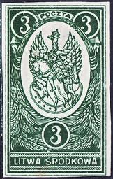 Keywords: Central Lithuania 1921 MiNr 036B B002.png Stamp of Central Lithuania; 1921; Michel No 36B postage stamp issue; 3 M ; Coat of arms of Central Lithuania<br /> Nominal value 3 Marka<br /> Color Russian green <br /> Watermark none<br /> Postage validity other date 1921-04 - other date 1922-04-16 <br /> Paper thin paper scan of original other date 1921-04 Postal administration for Lithuania Polishsymbol PD-LT-exempt stamps PD-old-70 <gallery> File Central Lithuania 1921 MiNr036B KDhalf B002 jpg half-page invert misprint of the Press of the same stamp Michel No 36B </gallery> Philately New coat of arms of Central Lithuania in vertical oval other date 1921-04 Postal administration for Central Lithuania State Press Warsaw lithographic printing 5 000 000 perforated + imperforate none imperforate Mittellitauen Nr 36B 1921 stamps of Central Lithuania Coats of arms of Lithuania on stamps Green stamps Imperforate stamps |