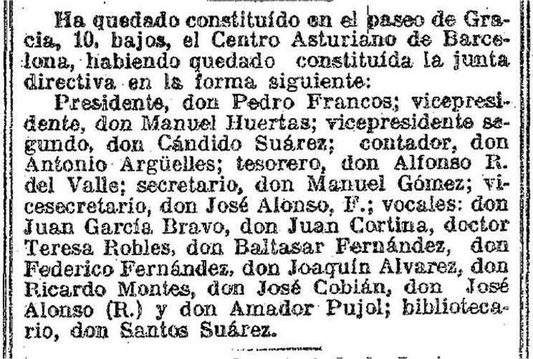 | Keywords: Centro-Asturiano-1911-12-05-paseo-de-Gracia-10.jpg es El Centro Asturiano de Barcelona ha quedado constituido en el Paseo de Gracia 10 bajos Presidente Don Pedro Francos 1911-12-05 La Vanguardia Barcelona del 5 12 1911 pag 3 La Vanguardia es Ha quedado constituido en el paseo de Gracia 10 bajos el Centro Asturiano de Barcelona habiendo quedado constituida la junta directiva en la forma siguiente Presidente don Pedro Francos; vicepresidente don Manuel Huertas; vicepresidente segundo don Candido Suarez; contador don Antonio Arguelles; tesorero don Alfonso R del Valle; secretario don Manuel Gomez; vicesegretario don José Alonso F ; vocales don Juan Garcia Bravo don Juan Cortina doctor Teresa Robles don Baltasar Fernandez don Federico Fernandez don Joaquin Alvarez don Ricardo Montes don José Cobian don José Alonso R y don Amador Pujol; bibliotecario don Santos Suarez PD-old Juan Garcia-Bravo Menendez Centro Asturiano de Barcelona Centro Asturiano en Barcelona La Vanguardia advertisements 1911 1911 advertisements in Spain 1911 in Barcelona Passeig de Gràcia ImageNote 1 24 12 699 472 744 501 2 Ha quedado constituido en el paseo de Gracia 10 bajos el Centro Asturiano de Barcelona habiendo quedado constituida la junta directiva en la forma siguiente Presidente don Pedro Francos; vicepresidente don Manuel Huertas; vicepresidente segundo don Candido Suarez; contador don Antonio Arguelles; tesorero don Alfonso R del Valle; secretario don Manuel Gomez; vicesegretario don José Alonso F ; vocales don Juan Garcia Bravo don Juan Cortina doctor Teresa Robles don Baltasar Fernandez don Federico Fernandez don Joaquin Alvarez don Ricardo Montes don José Cobian don José Alonso R y don Amador Pujol; bibliotecario don Santos Suarez ImageNoteEnd 1 |