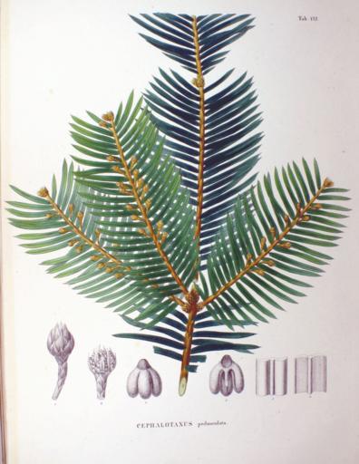 | Keywords: Cephalotaxus pedunculata SZ132.png Plate of Cephalotaxus harringtonia syn C pedunculata from book Flora Japonica Sectio Prima Tafelband 1870 Philipp Franz von Siebold and Joseph Gerhard Zuccarini see http //www biolib de PD-old Cephalotaxus harringtonia Flora Japonica Taxaceae botanical illustrations |