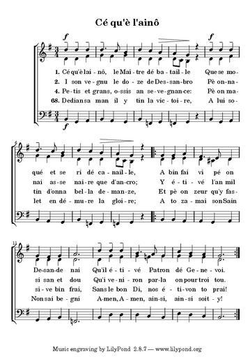 Keywords: Cequelaino.png Music and lyrics of the w fr Cé qu'è lainô the offical anthem of Geneva Music of the w fr Cé qu'è lainô; lyrics for the four stanzas usually sung are also included Typeset by User Schutz using w en Lilypond Original version around 1603; typeset in January 2007 Author The original lyrics and music are in the public domain due to their age musical notation LilyPond source <pre> Cé qu'è l'ainô \header title Cé qu'è l'ainô \paper line-width 15\cm paper-width 17\cm paper-height 25\cm top-margin 0\cm bottom-margin 0 5\cm left-margin 1\cm right-margin 1\cm \relative \time 3/4 \new ChoirStaff << \new Staff << \key g \major \new Voice main \voiceOne \dynamicUp \key g \major d'--\f d-- d-- d4 -- c8 b4 d c b\> a g\ r d'--\f d-- d-- d4 -- c8 b4 d c b\> a g\ r \repeat volta 2 g g a fis4 e8 d4 g4 fis g a2 d4-- d-- d-- b4 a8 g4 c b a g2 \new Voice second \voiceTwo \key g \major d4 d fis g fis g d d d d8 c b4 r d d fis g fis g d d d d8 c b4 r d e e d cis d d d d d2 d4 g fis g f g g g fis d2 >> \new Lyrics \lyricsto main \set stanza 1 Cé qu'è lai -- nô le Maî -- tre dé ba -- tail -- le Que se mo -- qué et se ri dé ca -- nail -- le A bin fai vi pé on De -- san -- de nai Qu'il é -- ti -- vé Pa -- tron dé Ge -- ne -- voi \new Lyrics \lyricsto main \set stanza 2 I son ve -- gnu le do -- ze de Des -- san -- bro Pè on -- na -- nai as -- se nai -- re que d'an -- cro; Y é -- ti -- vé l'an mil si san et dou Qu'i ve -- ni -- ron par -- la on pour troi tou \new Lyrics \lyricsto main \set stanza 4 Pe -- tis et grans o -- ssis an se -- ve -- gnan -- ce Pè on ma -- tin d'on -- na bel -- la de -- man -- ze Et pè on zeur qu'y fas -- si -- ve bin frai Sans le bon Di nos é -- ti -- von to prai \new Lyrics \lyricsto main \set stanza 68 De -- dian sa man il y tin la vic -- toi -- re A lui so -- let en dé -- mu -- re la gloi -- re; A to za -- mai son Sain Non sai be -- gni A -- men A -- men ain -- si ain -- si soit -- y \new Staff << \clef bass \key g \major \new Voice b 4 \f g a b a g b f g f g r b g a b a g b f g f g r b b a a g a g a b f2 b4 d d d c b e d c b2 >> >> \version 2 8 7 </pre> PD-old L'Escalade Franco-Provençal language Images with LilyPond source code |
