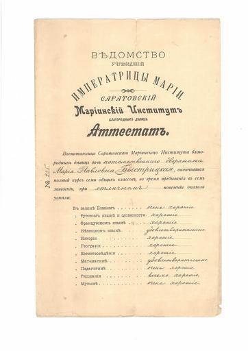 | Keywords: Certificate of the Saratov Finishing School (1904). P. 1.jpg ru Аттестат а ии Павловны Быст ицкой в замужестве Людоговской; 1886-1973 об окончании Са атовского а иинского института благо одных девиц 1904 С 1 1904 Home archives of Fedor Lyudogovskiy author other versions Custom license marker 2015 05 20 PD-old Uploaded with UploadWizard Finishing school for maidens Saratov House of Bystritskiy House of Lyudogovskiy 1904 documents | ||||