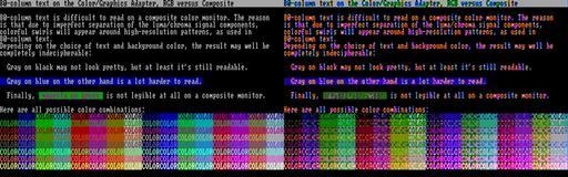 | Keywords: CGA CompVsRGB Text.png  CGA 80-column text display on RGB vs Composite monitors en wikipedia Tothwolf CommonsHelper 2007-07-24 NewRisingSun wikipedia en Created with the following BASICA code 10 COLOR 7 0 CLS DEFINT A-Z 20 LOCATE 1 1 COLOR 0 7 PRINT 80-column text on the Color/Graphics Adapter RGB versus Composite 30 LOCATE 3 1 COLOR 7 0 PRINT 80-column text is difficult to read on a composite color monitor The reason 40 PRINT is that due to imperfect separation of the luma/chroma signal components 50 PRINT colorful swirls will appear around high-resolution patterns as used in 60 PRINT 80-column text 70 PRINT Depending on the choice of text and background color the result may well be 80 PRINT completely indecipherable PRINT 90 COLOR 7 0 PRINT Gray on black may not look pretty but at least it's still readable PRINT 100 COLOR 7 1 PRINT Gray on blue on the other hand is a lot harder to read PRINT 110 COLOR 7 0 PRINT Finally ; COLOR 5 2 PRINT magenta on green ; COLOR 7 0 PRINT is not legible at all on a composite monitor PRINT 120 PRINT Here are all possible color combinations 130 FOR F 0 TO 15 FOR B 0 TO 7 140 COLOR F B PRINT COLOR ; 150 NEXT B NEXT F 160 X INKEY IF X THEN GOTO 160 NewRisingSun original upload log page en wikipedia CGA_CompVsRGB_Text png 2009-09-09 20 56 NewRisingSun 1280×400× 204828 bytes <nowiki></nowiki> 2007-07-24 23 29 NewRisingSun 1280×400× 181472 bytes <nowiki></nowiki> Computer graphic color codes CGA |