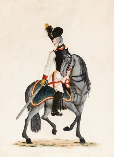 Keywords: CH-NB - Hohenzollern - Collection Gugelmann - GS-GUGE-FEYERABEND-E-32.tif Information Hohenzollern; Der Reiter sitzt nach rechts auf einem grauen Pferd das Schwert in der Hand Er trägt einen Zweispitz mit schwarzweissem Federbusch Österreichische Farben Weisser Uniformrock darüber ein schwarz gefärbter Kürass mit gelben Epauletten Schwarze Halsbinde der Kürass oben rot eingefasst Ärmel-Aufschläge rot ebenfalls sind die Uniform-Schösse rot eingefasst Gelbe Handschuhe Goldknöpfe Sehr hohe Schaftstiefel Schabracke blau rot-gold-rot eingefasst ; Hohenzollern; Aquarell; Gouachemalerei Swiss National Library CH-NB-Collection Gugelmann PD-old-100 User Swiss National Library/Attribution-Recommendation GS-GUGE-FEYERABEND-E-32 http //www helveticarchives ch/detail aspx ID 477891 helveticarchives ch; Swiss National Library Prints and Drawings Department Uploaded with GWToolset CH-NB - Hohenzollern - Collection Gugelmann - GS-GUGE-FEYERABEND-E-32 http //upload-glam wikimedia ch/Gugelmann/GS-GUGE-FEYERABEND-E-32 tif Collection Gugelmann Media contributed by the Swiss National Library Franz Feyerabend Cavalry of Germany House of Hohenzollern Swabian branches 1793 in Switzerland 1793 paintings Saddle blankets |