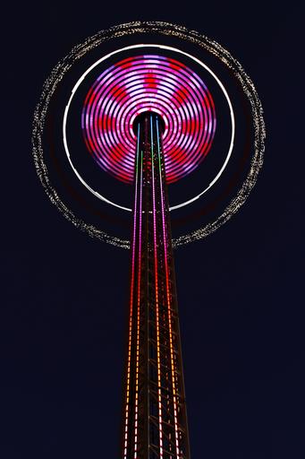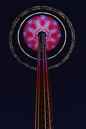 Keywords: chain aviator tower high 80m fair hustle and bustle year market folk festival carnies fairground pleasure fun leisure fun activity colorful entertainment speed color fast sit chains view no fear of heights upward height turn night lights light attraction