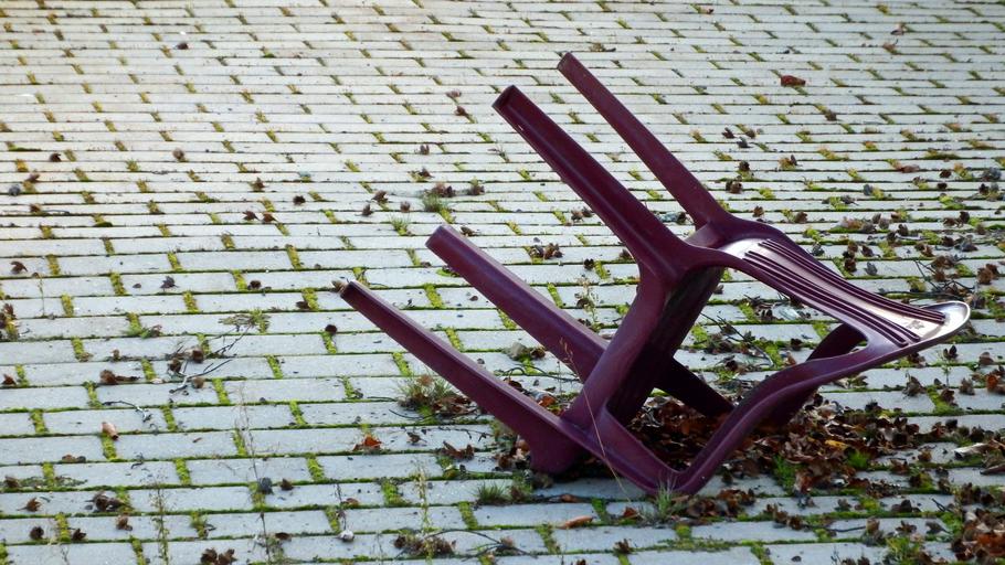 Keywords: chair garden chair patch overturned old seat garden chairs garden chairs outside catering resting place seating furniture out purple plastic autumn