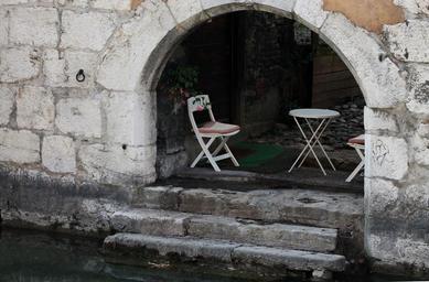Keywords: chairs terrace water river stairs