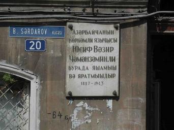 Keywords: Chamanzaminli plaque.jpg en Plaque on building where Azerbaijani writer Yusif Vazir Chamanzaminli lived in Baku - 20 Sardarov Street Plaque on building from the Soviet period reads in Azeri Cyrillic script Prominent Azerbaijani writer Y V Chamanzaminli 1887-1943 lived and created his literary works here Residents living in the building feared that it would soon be demolished and replaced with a high-rise apartment complex Photo 2008 own Betty Blair 2008-06 20 Sardarov Street Baku Azerbaijan Plaques in Baku Here-lived plaques in Baku Here-worked plaques in Baku Cc-zero Yusif Vazir Chamanzaminli |