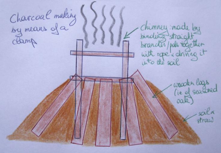 MAKE A MEME View Large Image Charcoal clamp.JPG en A schematic of a clamp Wooden logs are about 1 3m high and width between the stakes of the chimney is about the length of a stretched arm 70cm own KVDP 2010-02-15 Cc-zero Charcoal piles