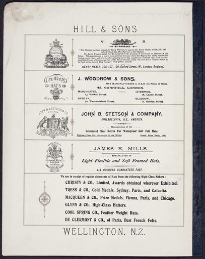 | Keywords: document text Shows panels with details of all four overseas hat manufacturers for which C Hill & Sons was the sole agent. Other makers who supplied hats to the company were: Christy & Company Ltd, Tress & Company, MacQueen & Company, Glynn & Company, Cool Spring Company, De Clermont & Company of Paris. Quantity: 1 colour photo-mechanical print(s). Physical Description: Lithograph, 360 x 282 mm. Charles Hill & Sons Ltd :Hill & Sons, [agents for] Henry Heath London; Woodrows Hats; John Stetson & Co Philad[elphi]a; James E Mills London. We are in receipt of regular shipments of hats ... Wellington, N.Z. [1897]. Charles Hill & Sons Ltd : Hill & Sons, Hat and Cap Manufacturers, Wellington, N.Z. Established 1875 [Catalogue]. McKee & Gamble, lith, Wellington, 1897.. Ref: Eph-C-COSTUME-1897-01-06. Alexander Turnbull Library, Wellington, New Zealand. natlib.govt.nz/records/23073051 Shows panels with details of all four overseas hat manufacturers for which C Hill & Sons was the sole agent. Other makers who supplied hats to the company were: Christy & Company Ltd, Tress & Company, MacQueen & Company, Glynn & Company, Cool Spring Company, De Clermont & Company of Paris. Quantity: 1 colour photo-mechanical print(s). Physical Description: Lithograph, 360 x 282 mm. Charles Hill & Sons Ltd :Hill & Sons, [agents for] Henry Heath London; Woodrows Hats; John Stetson & Co Philad[elphi]a; James E Mills London. We are in receipt of regular shipments of hats ... Wellington, N.Z. [1897]. Charles Hill & Sons Ltd : Hill & Sons, Hat and Cap Manufacturers, Wellington, N.Z. Established 1875 [Catalogue]. McKee & Gamble, lith, Wellington, 1897.. Ref: Eph-C-COSTUME-1897-01-06. Alexander Turnbull Library, Wellington, New Zealand. natlib.govt.nz/records/23073051 |
