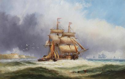 Keywords: Charles James De Lacy - The Isle of Wight Pilot Boat hailing an outward bound ship (1887).jpg Artwork Creator Charles James De Lacey 1887 oil on canvas cm 20 3 30 5 object history credit line 'C J de Lacy / 87 ~ lower right signature / date accession number http //www bonhams com/auctions/11998/lot/96/ Bonhams PD-old-auto-1923 1936 Charles John De Lacy Images from Bonhams 19th-century sailing ships in paintings
