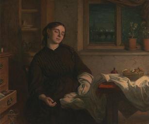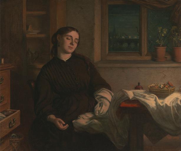 Keywords: Charles West Cope - Home Dreams - Google Art Project.jpg No inscription Inscription _Signed_and_Dated Signed and dated in red paint lower right CWC 1869 monogramed Not on View Oil on canvas on panel plate sleeping night night interior seamstress Victorian woman dream thread window sill spool window window drawers furniture components plants plants chair table costume thimble tankard sewing basket cityscape genre subject special url_id IgFoLfiuN0X84g PD-old-100-1923 1890 Charles West Cope Google Art Project works by Charles West Cope Sleeping women in art