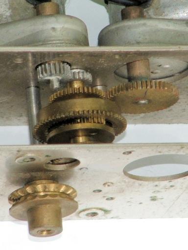 Keywords: ChartDriveDetail.JPG chart recorder One synchronous motor drives the annular gear of an epicyclic differential while the other drives the Sun and planet gear sun gear The output shaft driven by the plate holding the pivots for the Sun and planet gear planet gears turns at one of 3 different speeds depending on the combination of motors currently running The mechanism was made by Cramer Controls Corp no earlier than 1961 The outside diameter of the drum supporting the annular gear of the differential is 0 95 inches 54 mm 2014-05-25 16 52 13 own Douglas W Jones cc-zero Uploaded with UploadWizard Differentials Chart recorders Location not applicable |