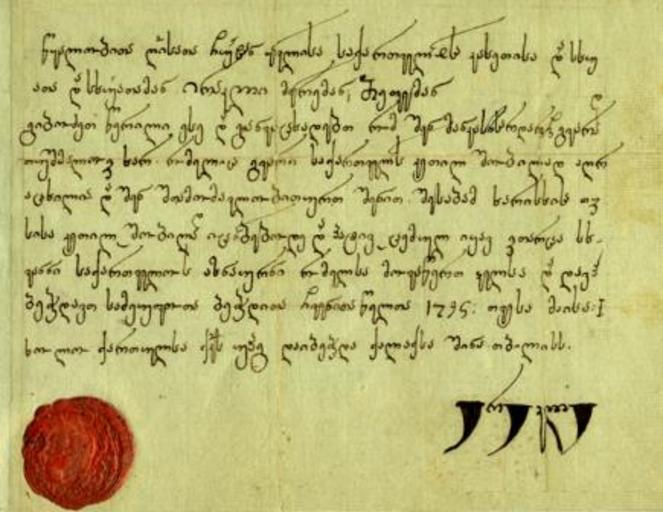 | Keywords: Charter of ErekleII.JPG en The charter issued by the Georgian king Erekle II in Tbilisi 1795 http //www archives gov ge/index php page samartlebrivi_zeglebi National Archives of Georgia Erekle II of Georiga 1795-05-01 PD-old-100 ImageNote 1 280 234 118 72 435 336 2 200px<br/> File King erekle's signature png ImageNoteEnd 1 Erekle II Charters 1795 documents Mkhedruli royal charters Georgia in the 18th century National Archives of Georgia | ||||