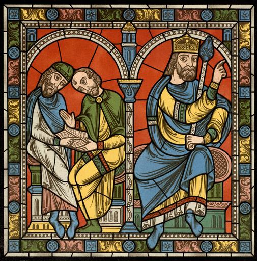 View Original:Chartres VITRAIL DE LA VIE DE JÉSUS-CHRIST Motiv 05 Le roi Hérode avec les Savants de la synagogue.jpg (2668x2707)