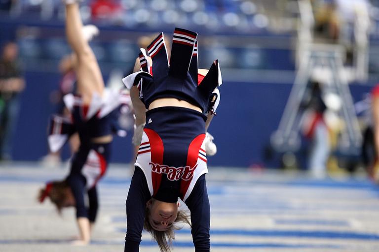 Keywords: cheerleader somersault acrobatic american football game motivation activity uniform play active high school youth young female girls hand stand flip athletic entertainment enjoyment
