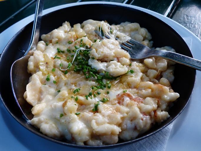 Keywords: cheese noodles eat court substantial tasty spicy cheese spätzle main course beer garden food pan fry up chives spoon fork