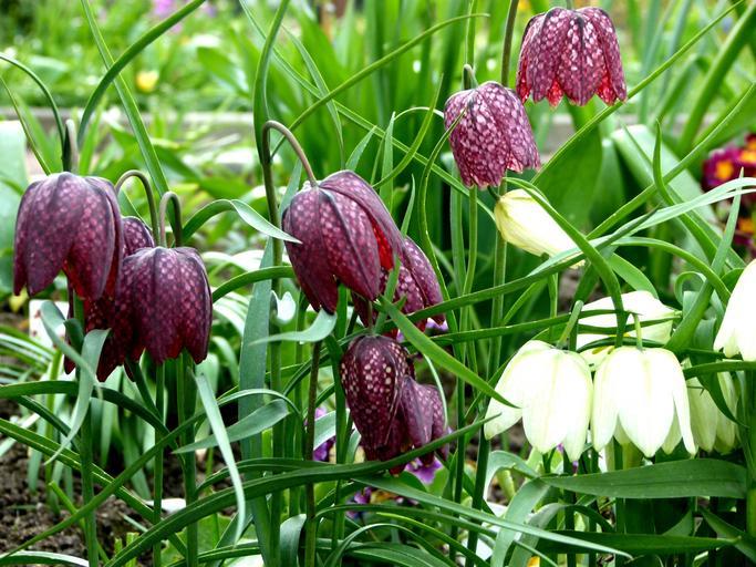 Keywords: chequered flowers white purple violet fritillaria spring