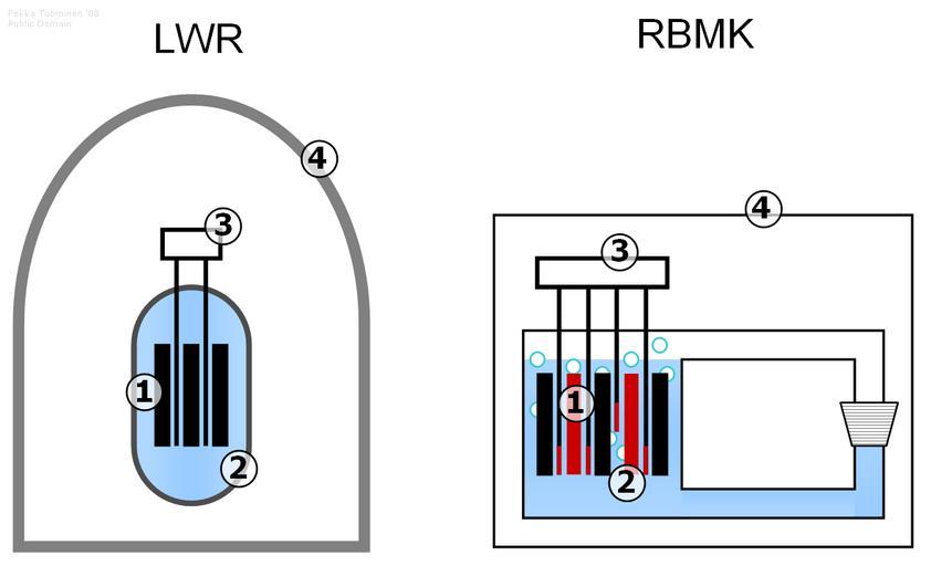 Keywords: Chernobyl-LWR-comparison.PNG The critical differences in the RBMK reactor compared to a LWR Light Water Reactor that directly contributed to the Chernobyl disaster 1 The flamable graphite moderator in the reactor core that burned in the fire 2 The positive void coefficient in the water that made possible the power peak that blew the reactor vessel 3 The control rods were very slow they took 18-20 seconds to be inserted into the reactor Moreover they had graphite tips that actually intensified the fission chain reaction in the beginning of the insertion 4 No containment building at all self-made data from IAEA http //www-pub iaea org/MTCD/publications/PDF/Pub913e_web pdf INSAG-7 The Chernobyl Accident Updating of INSAG-1 Vienna 1992; NEA http //www nea fr/html/rp/reports/2003/nea3508-chernobyl pdf Chernobyl - Assessment of Radiological and Health Impacts Pariisi 2002; Nakao M http //shippai jst go jp/en/Detail fn 2 id CA1000644 Chernobyl Accident University of Tokyo 2006 2008-02-15 Tungsten Schemata of nuclear reactors IAEA Chernobyl Nuclear Power Plant |