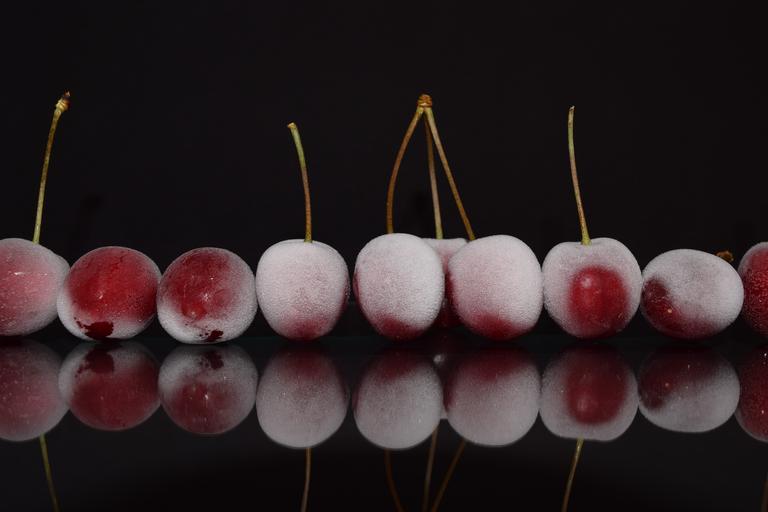 Keywords: cherries red close mirroring frosted frozen delicious frisch gut healthy
