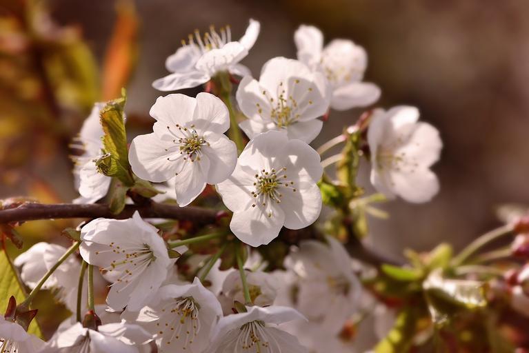 Keywords: cherry blossom cherry branch flowers white evening light evening sun close