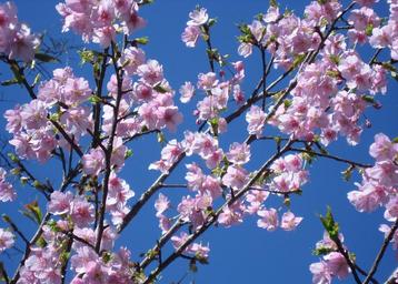 Keywords: cherry flowers pink branch leaf blue sky blue spring hotel city tokyo takanawa japan