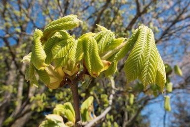 Keywords: chestnut buckeye aesculus hippocastanum leaf foliation spring tree light green first drive branch young