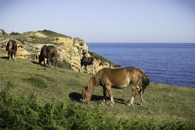 Keywords: chevaux mer océan espagne nature outdoor grassland field landscape animal Sur le chemin en Espagne. Sur le chemin en Espagne.