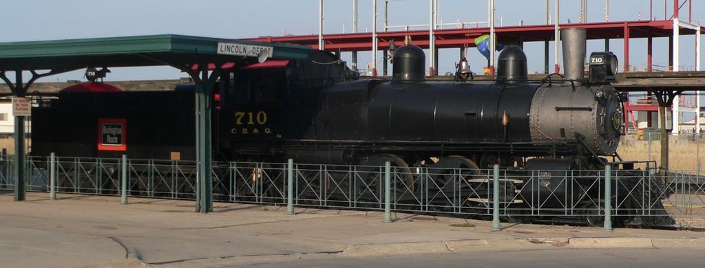 | Keywords: Chicago Burlington Quincy Locomotive 710 (2).JPG en Chicago Burlington Quincy Steam Locomotive No 710 now on display in the Haymarket District in Lincoln Nebraska 2012-07-08 own Ammodramus cc-zero Pictures by Ammodramus Taken with Panasonic Lumix DMC-FZ20 Chicago Burlington and Quincy locomotive 710 Uploaded with UploadWizard |