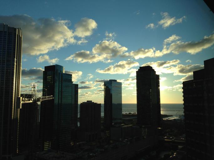 Keywords: chicago skyline sunset twilight lake michigan clouds buildings cityscape architecture dusk sky urban
