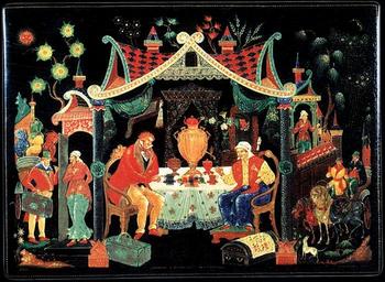 | Keywords: Chichikov visiting Korobochka (Salabanov).jpg ru Чичиков у Ко обочки Шкатулка 1936 Г ПИ 1936 http //palekh narod ru/win/salab_vm htm Василий ихайлович Салабанов 1902 1941 other versions Custom license marker 2016 01 26 PD-Old-70 Vasily Salabanov Palekh Miniature Dead Souls |
