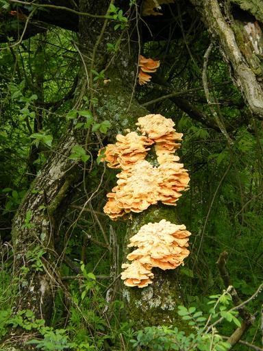 Keywords: Chicken of the woods.JPG en Chicken of the woods fungus growing on shaded tree trunk Delaware 2008-11-10 02 37 46 own PookieFugglestein cc-zero Uploaded with UploadWizard Unidentified Laetiporus Tree trunks Fungal attack on tree trunks