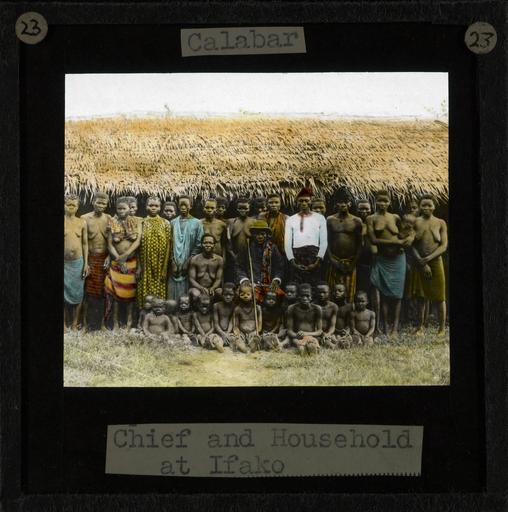 | Keywords: "Chief and Household at Ifako, Calabar", late 19th century (imp-cswc-GB-237-CSWC47-LS2-023).jpg en <br> Chief and Household at Ifako Calabar late 19th century Group picture of the Chief of Ifako and his household The chief is seated outside a thatched hut with a group of children seated at his feet and a row of adults standing behind him ; Ifako is located in later day Nigeria Mary Slessor the Scottish Missionary secured permission from the chief to locate a mission building here for the refuge of distressed folk Photographer Unknown Filename imp-cswc-GB-237-CSWC47-LS2-023 tif Coverage date circa 1880 Part of collection International Mission Photography Archive ca 1860-ca 1960 Type images Part of subcollection Photographs from the Centre for the Study of World Christianity University of Edinburgh U K ca 1900-ca 1940s Repository name Centre for the Study of World Christianity Archival file impaunpub_Volume7/1296 url Repository address The University of Edinburgh School of Divinity New College Mound Place Edinburgh EH1 2LX United Kingdom Geographic subject country Nigeria Format aacr2 1 lantern slide 8 x 8 cm Geographic subject continent Africa Rights Contact the repository for details Part of series Mary Slessor LS2 Repository email divinity-CSWC ed ac uk Subject lcsh Keyword Village communities; Religion Date created circa 1880 Publisher of the digital version University of Southern California Libraries Subject aat genre group portraits Format aat lantern slides Legacy record ID impa-m68166 Access conditions http //www ed ac uk/schools-departments/divinity/research/centres/world-christianity/collections-resources File GB 237 CSWC47/LS2/23 1880 author http //digitallibrary usc edu/cdm/ref/collection/p15799coll123/id/64419 PD-old-70-1923 Magic lantern images Images from USC Digital Library uploaded by Fæ International Mission Photography Archive ca 1860-ca 1960 People of Nigeria Calabar |