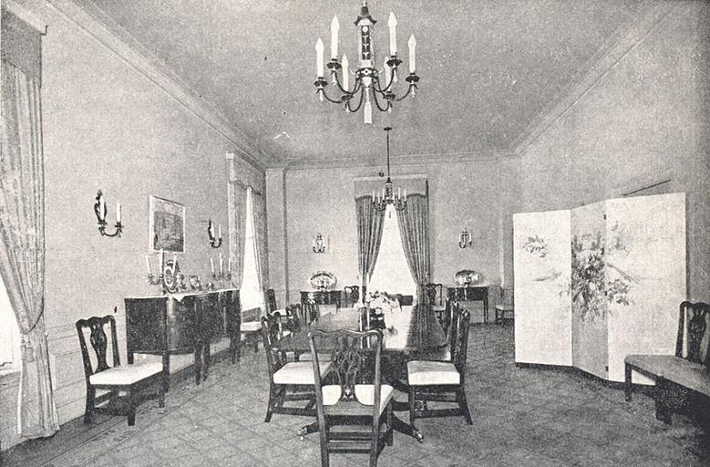 | Keywords: cmr embassy usa eeuu uruguay (1946) The main dining room admirably combines the Sheraton table with comfortable Chippendale chairs, ivory-colored upholsteries. The mahogany furniture harmonizes with pearl gray of the walls, giving a hint of color to the sumptuous gold-yellow window curtains. A screen etched with screens from a Colonial-era hunt, together with the black and silver Chinese-style Chippendale chandeliers; highlight the original layout of this magnificent overall decoration. Beige colored rug. English and North American silverware. The residence of the U.S. Ambassador to Uruguay was completed and officially inaugurated in September, 1942. (1946) En el gran comedor combinan admirablemente el aparador y la mesa Sheraton con las cómodas sillas Chippendale, tapizadas en cuero marfil. La caoba de los muebles armoniza con el gris perla de los muros, dando la nota de color los suntuosos cortinados, amarillo-dorados, de las ventanas. Biombo litografiado con motivos de caza de la época colonial, junto con la arañas Chippendale de tipo chinesco, negras y plateadas, constituyen un original detalle de la magnífica decoración general. Alfombra tono beige. Platería de precedencia inglesa y americana. La residencia del Embajador de los Estados Unidos en Uruguay se completó y fue oficialmente inaugurada en setiembre de 1942. [Photo: Editorial Anales S.A. (1946)] (1946) The main dining room admirably combines the Sheraton table with comfortable Chippendale chairs, ivory-colored upholsteries. The mahogany furniture harmonizes with pearl gray of the walls, giving a hint of color to the sumptuous gold-yellow window curtains. A screen etched with screens from a Colonial-era hunt, together with the black and silver Chinese-style Chippendale chandeliers; highlight the original layout of this magnificent overall decoration. Beige colored rug. English and North American silverware. The residence of the U.S. Ambassador to Uruguay was completed and officially inaugurated in September, 1942. (1946) En el gran comedor combinan admirablemente el aparador y la mesa Sheraton con las cómodas sillas Chippendale, tapizadas en cuero marfil. La caoba de los muebles armoniza con el gris perla de los muros, dando la nota de color los suntuosos cortinados, amarillo-dorados, de las ventanas. Biombo litografiado con motivos de caza de la época colonial, junto con la arañas Chippendale de tipo chinesco, negras y plateadas, constituyen un original detalle de la magnífica decoración general. Alfombra tono beige. Platería de precedencia inglesa y americana. La residencia del Embajador de los Estados Unidos en Uruguay se completó y fue oficialmente inaugurada en setiembre de 1942. [Photo: Editorial Anales S.A. (1946)] |