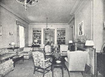 | Keywords: cmr embassy usa eeuu uruguay (1946) In the library, deep mahogany furniture, silk upholstery with Chinese motifs, atop a floor of green jade. The chairs and sofa provide the comfort and convenience. A bronze plated chandelier, matching color window curtains and sofa. Beige carpet. Above the 18th Century fireplace is oil by G. E. Luvis, on the ledge is a sports trophy belonging to Ambassador Dawson. The room is completed with practical mahogany coffee tables next to elegant Queen Anne and Chippendale chairs. The residence of the U.S. Ambassador to Uruguay was completed and officially inaugurated in September, 1942. (1946) Biblioteca de la residencia. Los muebles de caoba oscura, tapizados en seda con motivos chinos, sobre fondo verde jade. Los sillones y el sofá tienen el confort y la comodidad requeridos por el lugar, en beige liso y floreado. Araña de bronce plateado, el cortinado de la ventana del mismo tono que el tapiz del sofá. Alfombra beige, lisa. Sobre la estufa de fines del siglo XVIII, un óleo de G. E. Luvis, en la repisa, un trofeo deportivo propiedad del embajador Dawson. Decoración completada con prácticas mesas auxiliares, de caoba, junto a los elegantes sillones Queen Anne y Chippendale. La residencia del Embajador de los Estados Unidos en Uruguay se completó y fue oficialmente inaugurada en setiembre de 1942. [Photo: Editorial Anales S.A. (1946)] (1946) In the library, deep mahogany furniture, silk upholstery with Chinese motifs, atop a floor of green jade. The chairs and sofa provide the comfort and convenience. A bronze plated chandelier, matching color window curtains and sofa. Beige carpet. Above the 18th Century fireplace is oil by G. E. Luvis, on the ledge is a sports trophy belonging to Ambassador Dawson. The room is completed with practical mahogany coffee tables next to elegant Queen Anne and Chippendale chairs. The residence of the U.S. Ambassador to Uruguay was completed and officially inaugurated in September, 1942. (1946) Biblioteca de la residencia. Los muebles de caoba oscura, tapizados en seda con motivos chinos, sobre fondo verde jade. Los sillones y el sofá tienen el confort y la comodidad requeridos por el lugar, en beige liso y floreado. Araña de bronce plateado, el cortinado de la ventana del mismo tono que el tapiz del sofá. Alfombra beige, lisa. Sobre la estufa de fines del siglo XVIII, un óleo de G. E. Luvis, en la repisa, un trofeo deportivo propiedad del embajador Dawson. Decoración completada con prácticas mesas auxiliares, de caoba, junto a los elegantes sillones Queen Anne y Chippendale. La residencia del Embajador de los Estados Unidos en Uruguay se completó y fue oficialmente inaugurada en setiembre de 1942. [Photo: Editorial Anales S.A. (1946)] |