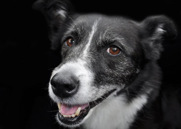 Keywords: Chienne croisee.jpg fr Chienne croisée Own MVeillet 2010-03 Border Collie hybrids Dog heads Portraits of dogs Black-and-white dogs Facial expressions of dogs Dogs with black background