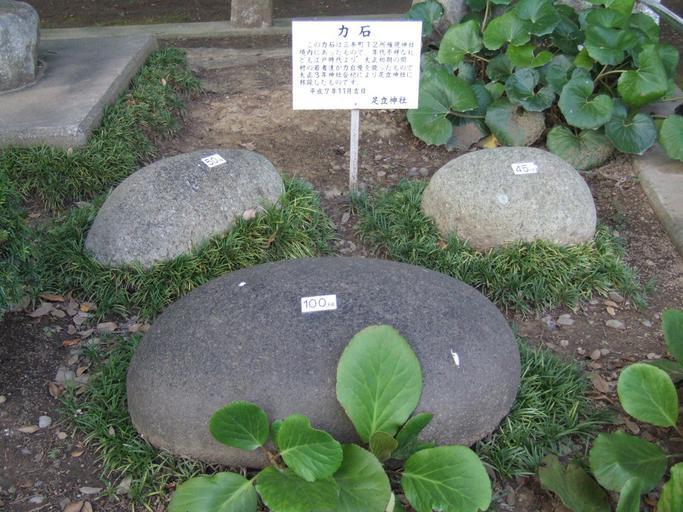 Keywords: ChikaraIshiAdachiJinjya2006.jpg Chikara Ishi Strength Stones in the Adachi Shrine Saitama Saitama prefecture Japan 2006-08-19 own assumed Kinori ja 足立神社の ja 力石 位置 - 日 国 埼玉 さいたま市 撮影日 - 2006年8 19日 撮影 - Kinori 江戸時代から大正 まで力比べに使われた 手前が100kg 左が50kg 右が45kg en Strength Stones in the Adachi Shrine Place - Saitama Saitama prefecture Japan Date -August 19 2006 Photographer - Kinori These had been used for challege of strength since the Edo Period untill 1920s Here is 100kg the left 50kg the right 45kg Chikaraishi Saitama Saitama