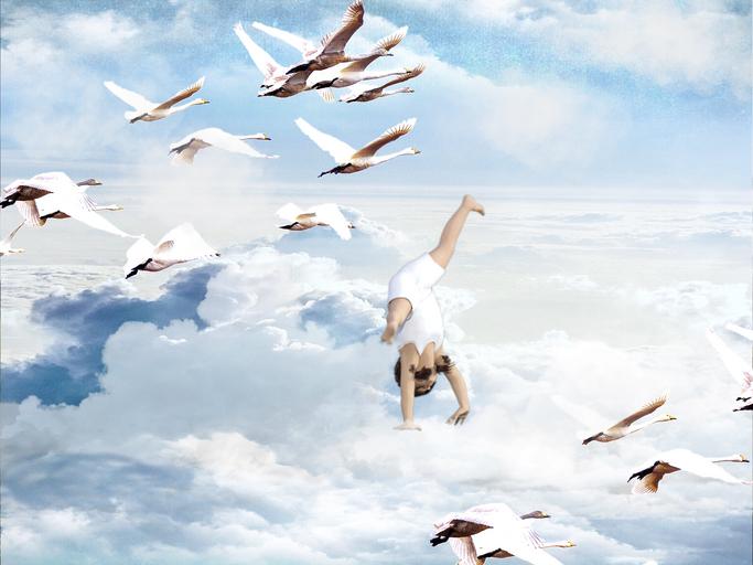 Keywords: child clouds sky swans fly wheel weightless playful freedom mood girl braids magical mystical fantasy dream movement atmosphere blue cheerful