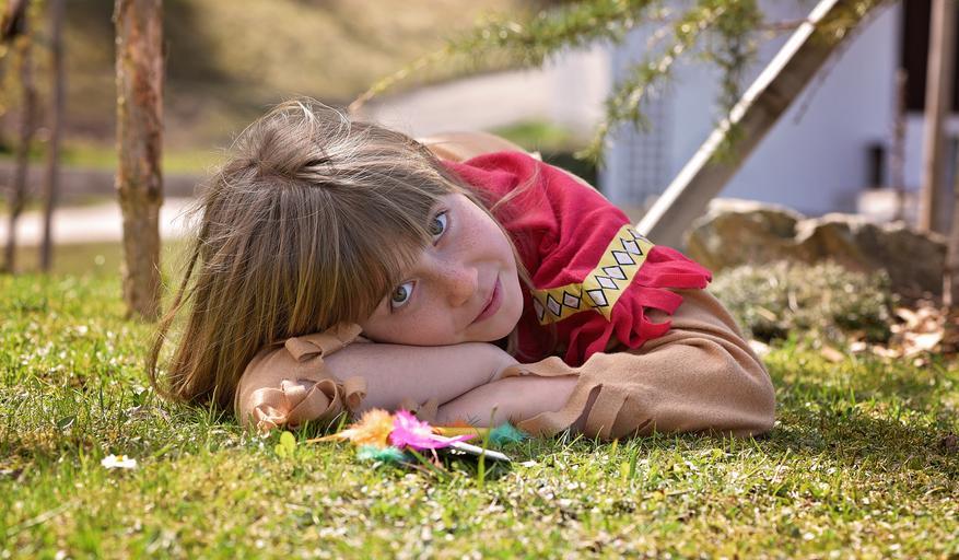 Keywords: child girl blond long hair face relaxed lying out nature indian portrait