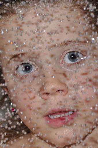 Keywords: child girl shower drop of water beaded face portrait eyes amazed surprised